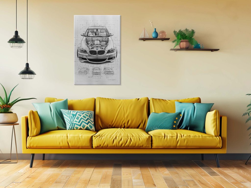 Obraz zobrazuje čiernobiely návrh s komplexnými technickými detailmi šedého osobného automobilu BMW, kde sú zreteľné vnútorné časti motora a interiéru. Na pozadí sú prítomné aj ďalšie návrhy automobilu z rôznych uhlov – horný, zadný, bočný a čelný pohľad, všetky označené presnými meraniami a proporčnými líniami.