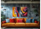 Obraz zobrazuje rozzúreného leva s ohnivým vzorom a modrými očami, obklopeného dynamickými farebnými prvkami.