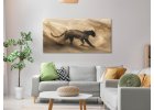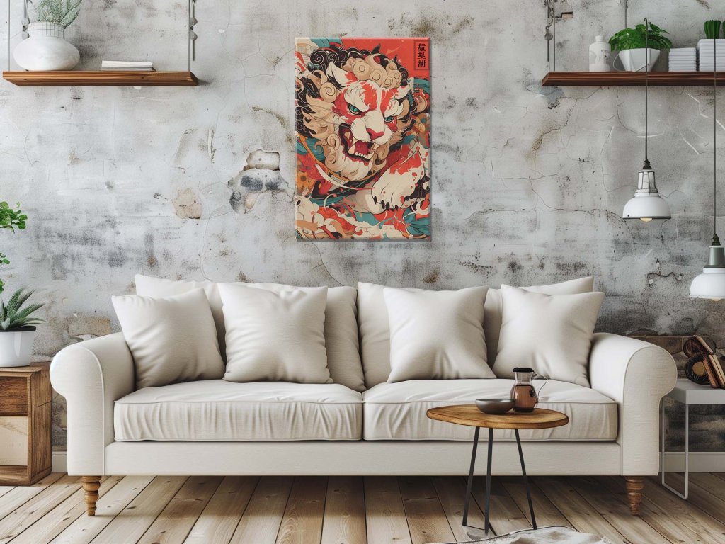 Na obraze je zobrazený lev s divokým výrazom tváre, ktorého srsť má ohnivý vzor v červených a bielych odtieňoch. Jeho výrazné modré oči pridávajú dramatickosť a intenzitu celému obrazu. Okolie je plné dynamických línií a farebných prvkov, ktoré zdôrazňujú energiu a silu tohto majestátneho zvieraťa. Celková kompozícia vytvára dojem neskrotného a mocného tvora, ktorý je zároveň krásny aj desivý.