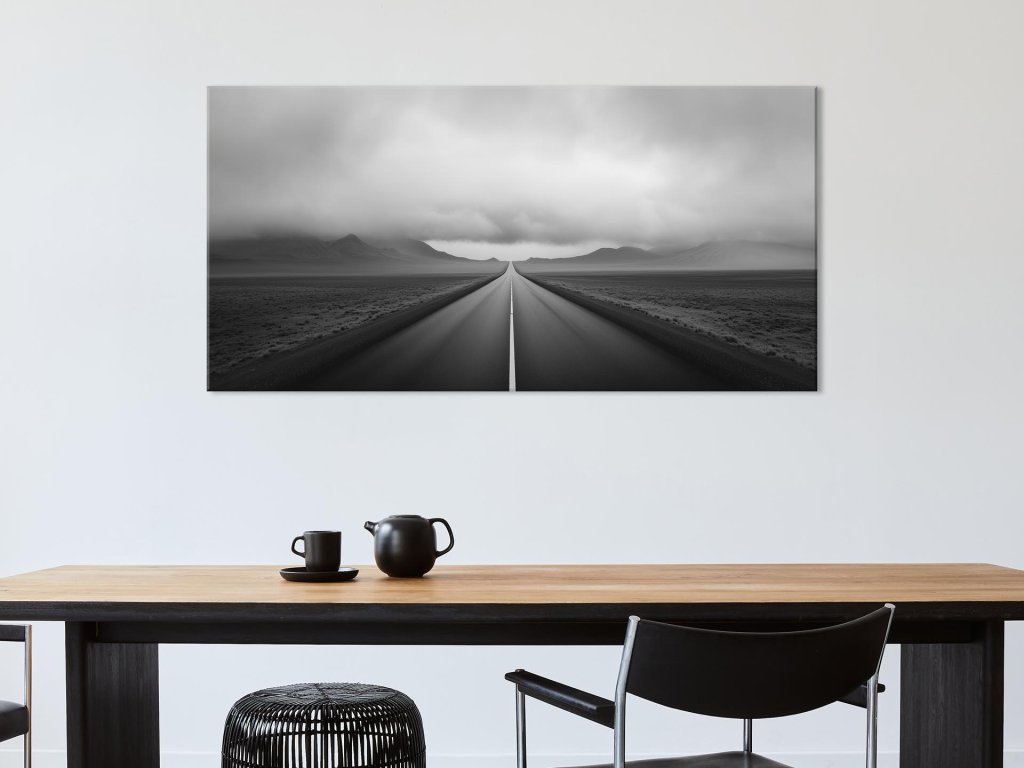 Obraz zobrazuje dlhú, osamelú cestu vedúcu rovno cez pustú krajinu, ktorá sa stráca v hustej hmle. Hory v diaľke sú čiastočne zahalené oblakmi, čím umocňujú atmosféru neistoty a ticha. Tento výjav evokuje pocity túžby, samoty a nekončiacej cesty v ústrety neznámemu cieľu.