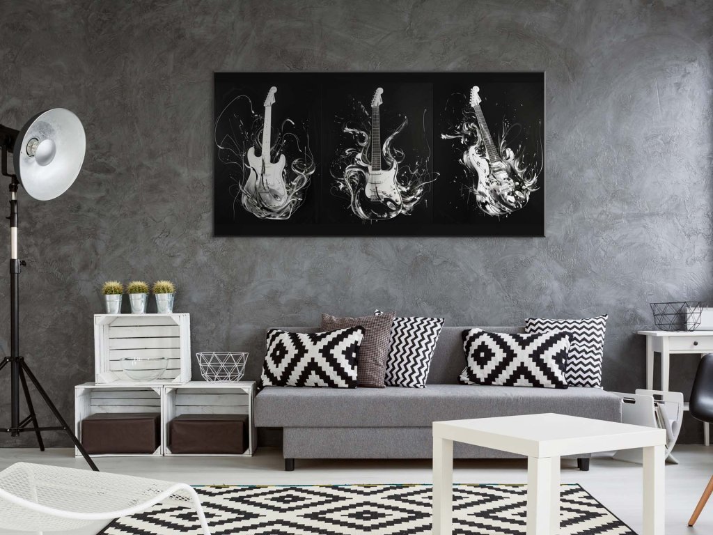 Tento obraz zobrazuje tri biele elektrické gitary, každú v jedinečnej póze, obklopenej čiernobielymi abstraktnými tvarmi a líniami. Dynamické vlny a prúdy okolo gitár vytvárajú dojem pohybu a energie, čo podčiarkuje dramatickú atmosféru obrazu. Minimalistická farebná paleta zdôrazňuje čistotu a eleganciu gitár, čím symbolizuje nadčasovosť a silu hudby v jej najväčšej forme.