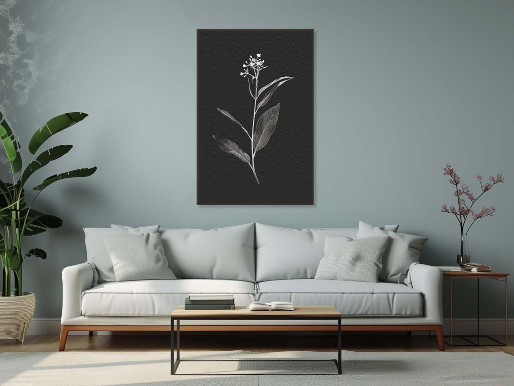 Tento obraz ukazuje kontrastné zobrazenie bielej, detailne kreslenej rastliny na tmavom pozadí, čo vytvára efekt vyčnievania a hĺbky. Linky a štruktúra listov sú zobrazené s precíznou eleganciou, čo podčiarkuje jednoduchú krásu prírody. Celková kompozícia je minimalistická a upokojujúca, s výrazným zmyslom pre detail a pozorovanie.