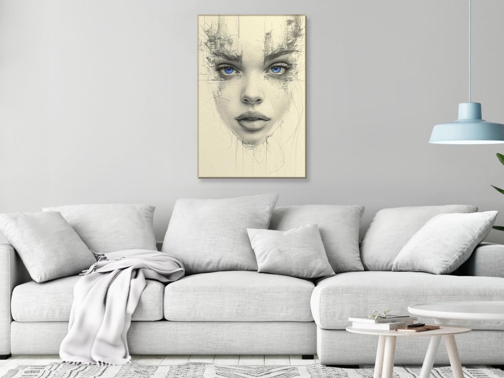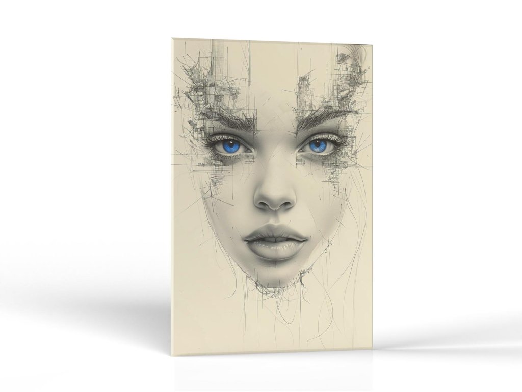 Detailný portrét ženy s výraznými modrými očami, tvár obklopená abstraktnými líniami a geometrickými tvarmi. Výrazná modrá farba uprostred čiero-bielej vyvoláva dojem premeny.