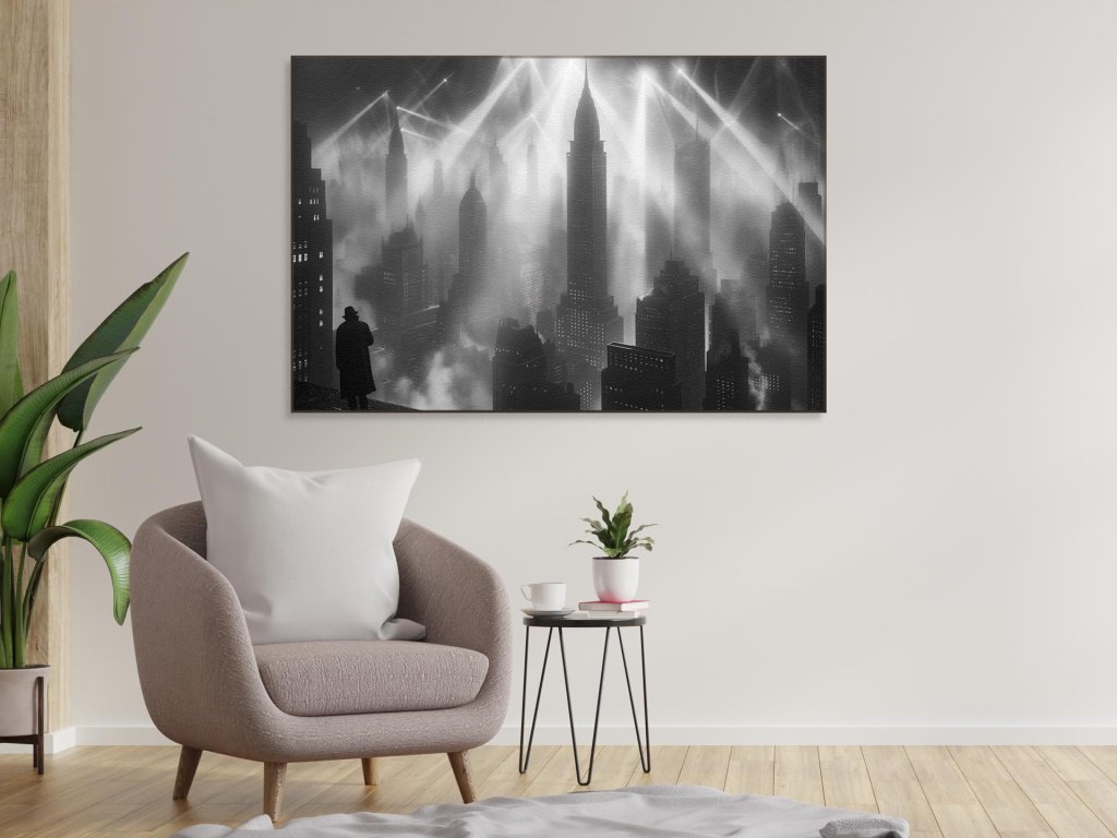 Obrázok zobrazuje siluetu muža pozorujúceho nočné mesto s osvetlenými mrakodrapmi a dramatickými lúčmi svetla presekávajúcimi hmlu. Kontrastné svetlá a tieň vytvárajú tajomnú a kinematickú atmosféru. Scéna pripomína klasický film noir s prvkami urbanistickej poézie a mysterióznej alegórie.