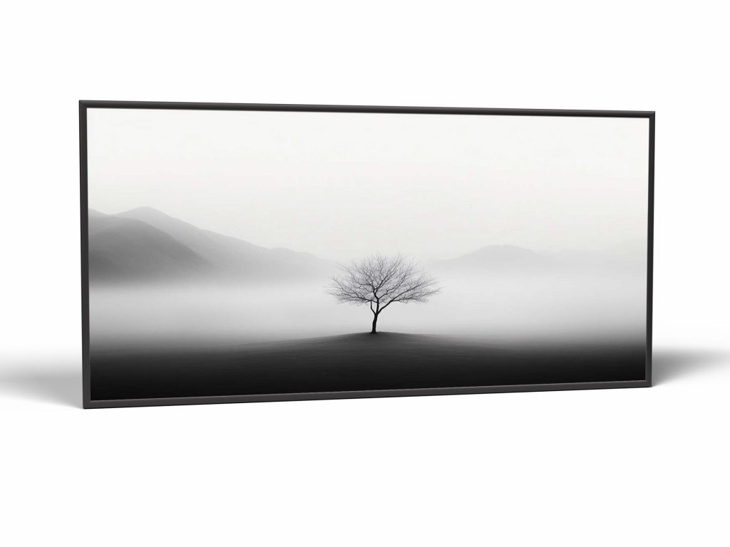Uprostred pokojnej scenérie sa nachádza jediný, bezlistý strom, ktorý kontrastuje s rozostretým hmlovým pozadím. Za ním sa rysujú siluety jemne zvlnených hôr, ktoré dodávajú obrazu pocit priestoru a vzdialenosti. Minimalistická kompozícia vyvoláva dojem samoty, ticha a večnosti prírodného okamihu.