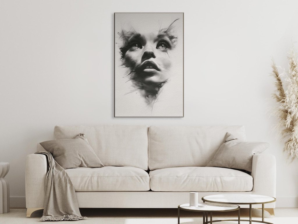 Na tomto umeleckom diele vidíme abstraktný portrét ženy, ktorý je akoby zachytený medzi realitou a snom. Obraz je prevedený v monochromatických tónoch, pričom hlavnou farbou je škála sivej. Detaily tváre sú zvýraznené tak, aby oči boli stredobodom pozornosti, čo dodáva hĺbku a intenzitu pohľadu zobrazeného subjektu. Okolie tváre je rozptýlené a rozfúkané, akoby v každom šteteče bol ukrytý príbeh, čo vytvára pocit pohybu a efemerality. Tento obraz je pravdepodobne výsledkom kombinácie tradičných kresliarskych techník a digitálneho umenia, čo mu dodáva moderný a dynamický nádych.
