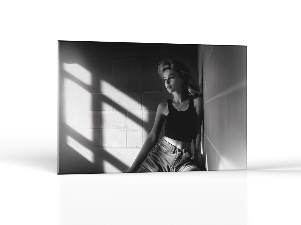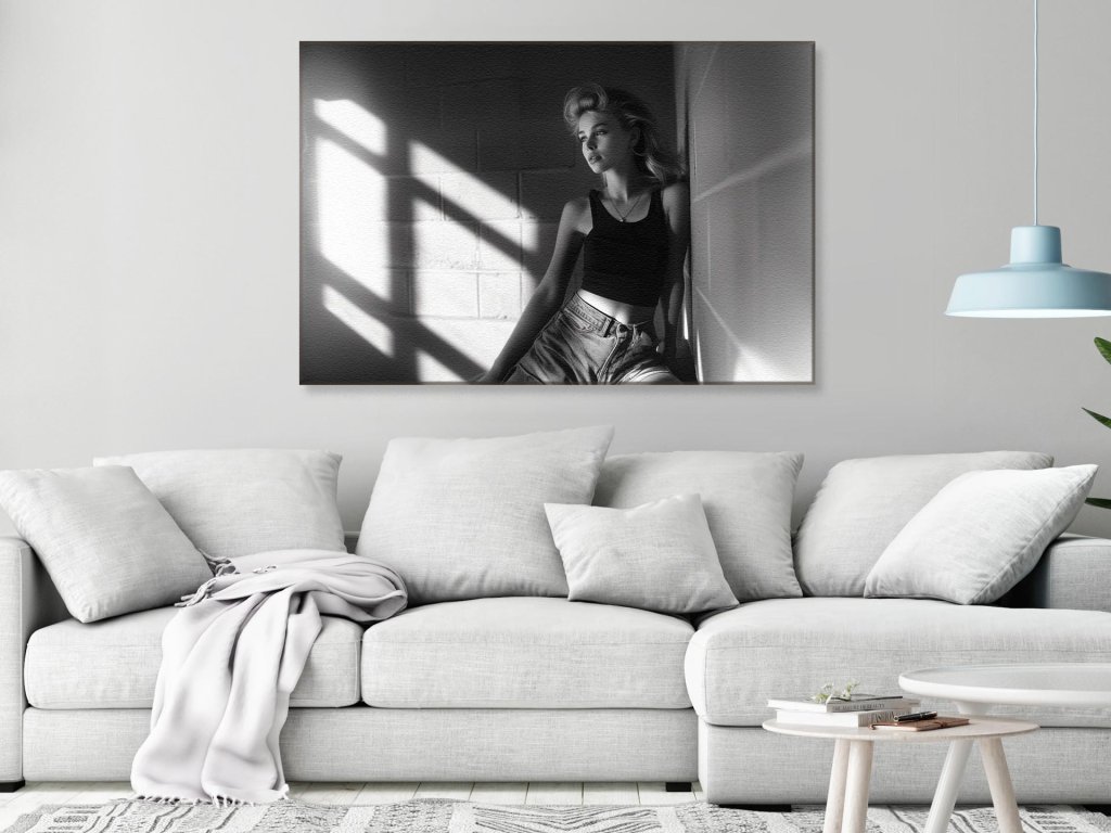 Mladá žena v čiernom tope a džínsoch pozoruje okolie, zatiaľ čo svetlo preniká cez okno a vytvára geometrické vzory na stene. Jej pohľad sa zdá byť zamyslený, čo dodáva obrázku atmosféru zamyslenia a pokoja. Scéna v čiernobielej farbe zvýrazňuje kontrasty a hrá sa so svetlom a tieňom v interiéri.