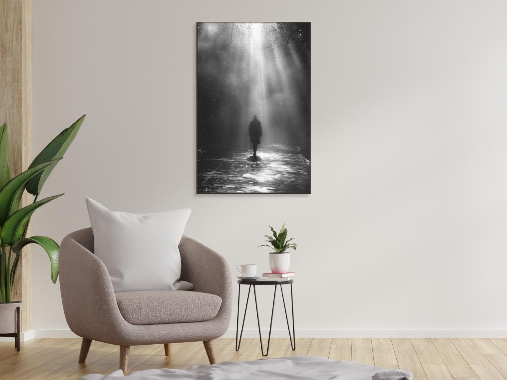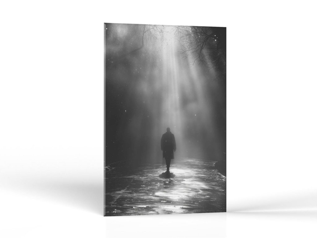 Na tomto mystickom zábere je vidieť postavu človeka odchádzajúceho do hlbín tajomného lesa, zatiaľ čo slnečné lúče prenikajú cez hmlu a odrážajú sa na vlhkom chodníku. Atmosféra obrázku je pokojná a zamyslená, pričom svetelné efekty dodávajú hĺbku a dimenziu scéne. Postava vzdialenej postavy dodáva obrazu pocit pokoja a izolácie.