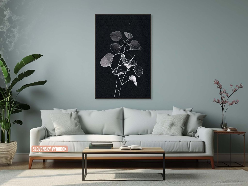 Na tomto obraze je znázornená rastlina s jemne vykreslenými listami, ktoré sú viditeľné vďaka kontrastným bielym líniám na tmavom pozadí. Detailné žilnatiny na každom liste pridávajú hĺbku a komplexnosť, čím vytvárajú ilúziu priehľadnosti a krehkosti. Celkový efekt je minimalistický a upokojujúci, s dôrazom na subtílnu krásu prírodných foriem.