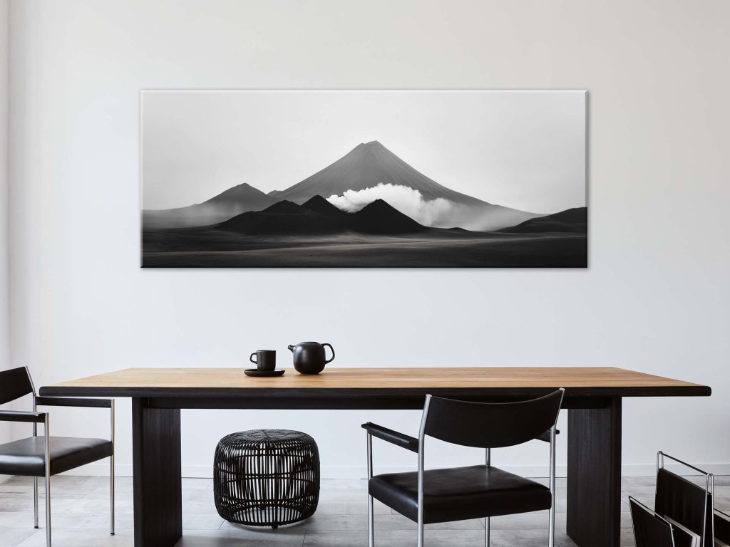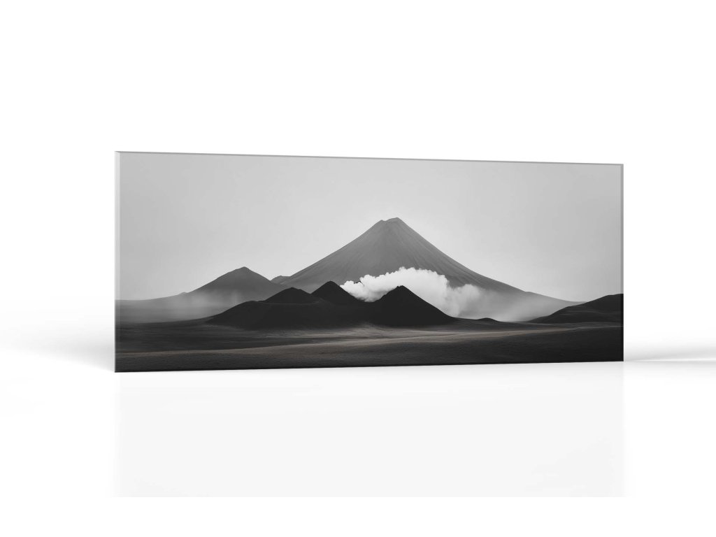 Obraz zachytáva impozantnú sopku týčiacu sa nad dramatickou krajinou, pričom biely dym stúpa z menších kopcov v popredí. Minimalistická farebná paleta čiernej, bielej a šedej vytvára atmosféru tajomnosti a surovej prírodnej krásy. Kompozícia pôsobí pokojne, no zároveň vyžaruje silu a energiu z neustálej aktivity skrytej pod povrchom.
