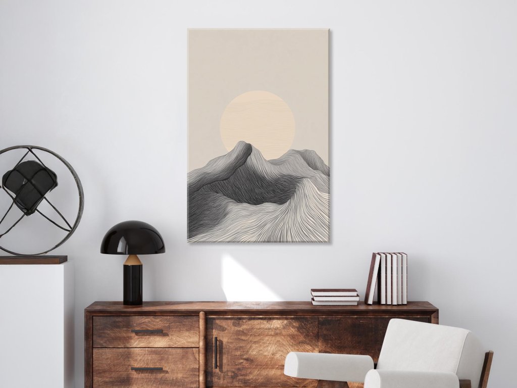 Obraz zachytáva minimalistickú krajinu, kde línie plynulo tvarujú siluetu horského pásma. Veľké slnko v pozadí vytvára jemný kontrast a dodáva scéne pocit pokoja a nadčasovosti. Táto ilustrácia pôsobí upokojujúco a kontemplatívne, evokujúc ticho prírody a rytmus krajiny.