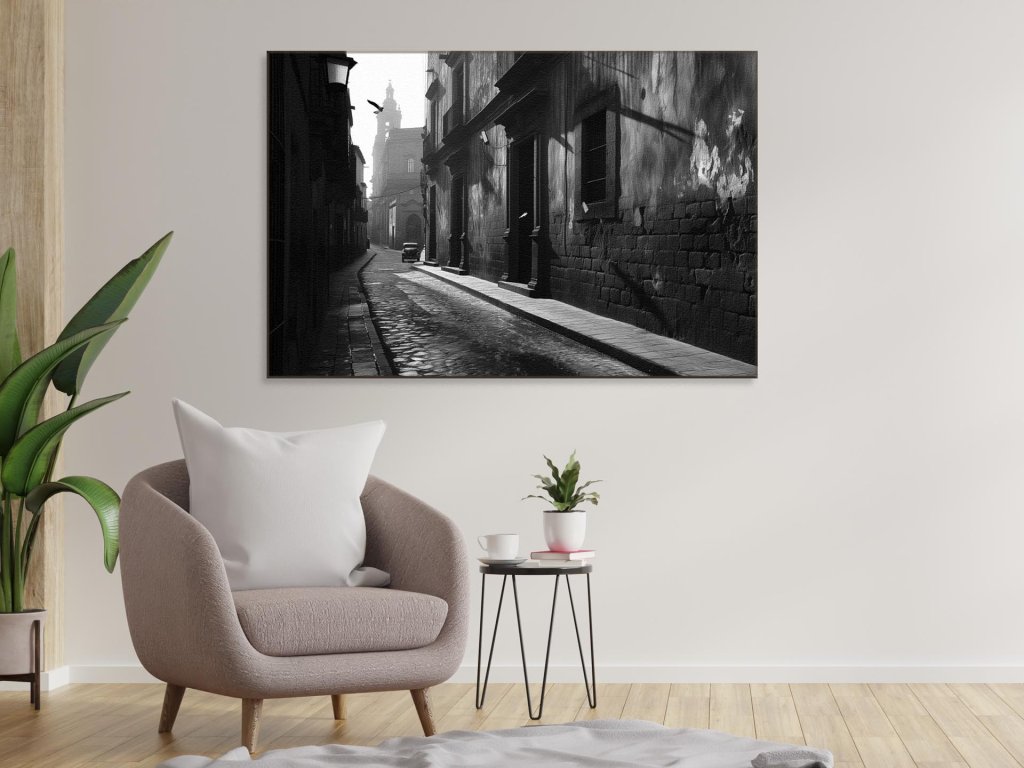 Historická ulička v ranných hodinách vytvára pocit ticha a pokoja, ktorý je zvýraznený ostrými tieňmi a svetelnými lúčmi prenikajúcimi do scény. Osvetlenie odhaľuje textúru starých budov a dláždenej cesty, pričom v pozadí je vidieť siluetu kostola. Scéna je oživená letiacim vtákom a zaparkovaným historickým vozidlom, čo dodáva kompozícii život a hĺbku.