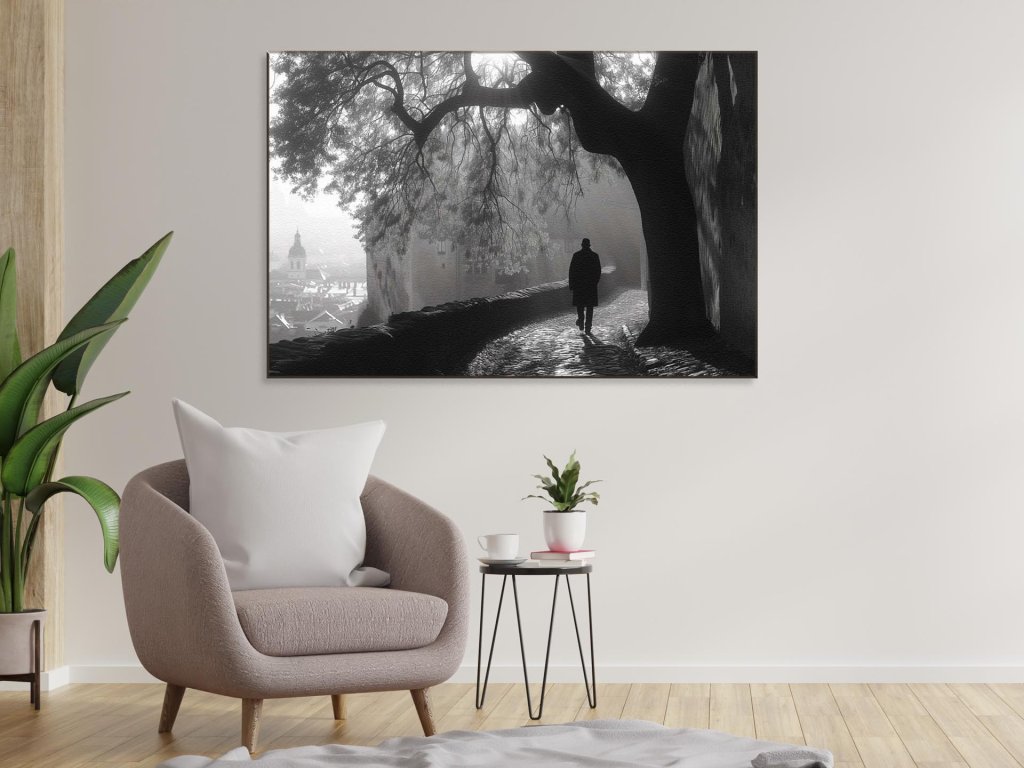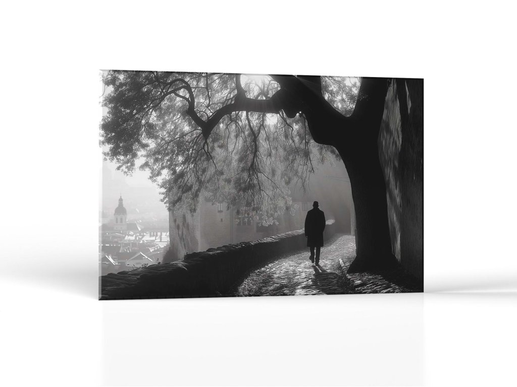 Na fotografii je zachytený osamelý chodec oblečený v dlhom kabáte, ktorý kráča popri starom kamennom múre. Obklopujú ho impozantné stromy a hmla, ktorá dodáva scenérii tajomnú a pokojnú atmosféru. V diaľke možno rozoznať obrysy historických budov a striech, ktoré sa zlievajú s hmlovým pozadím.