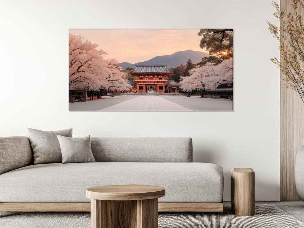 Na obraze je zachytený majestátny japonský chrám s charakteristickou červenou bránou, ktorý sa vyníma medzi rozkvitnutými sakurami. Jemné ružové kvety kontrastujú s architektúrou chrámu a vytvárajú poetickú atmosféru. V pozadí sa týčia zelené hory, zatiaľ čo teplé lúče zapadajúceho slnka presvitajú pomedzi stromy, dodávajúc celej scéne pokoj a harmóniu.