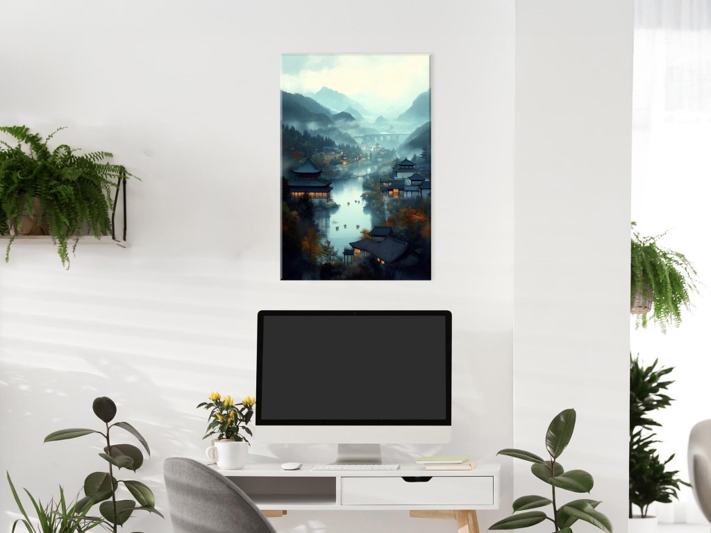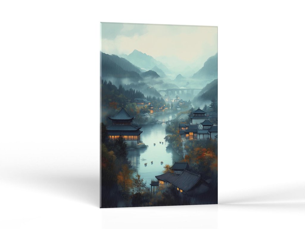 Obraz zachytáva tichú dedinku ukrytú medzi horami, kde sa rieka kľukatí medzi tradičnými pagodami a svetlá v oknách jemne žiaria do dažďovej tmy. Hmla a dážď vytvárajú mystickú atmosféru, akoby bol celý svet zastretý závojom ticha a pokoja. V diaľke sa črtajú mosty a siluety hôr, čím sa umocňuje dojem odlúčeného a magického miesta.