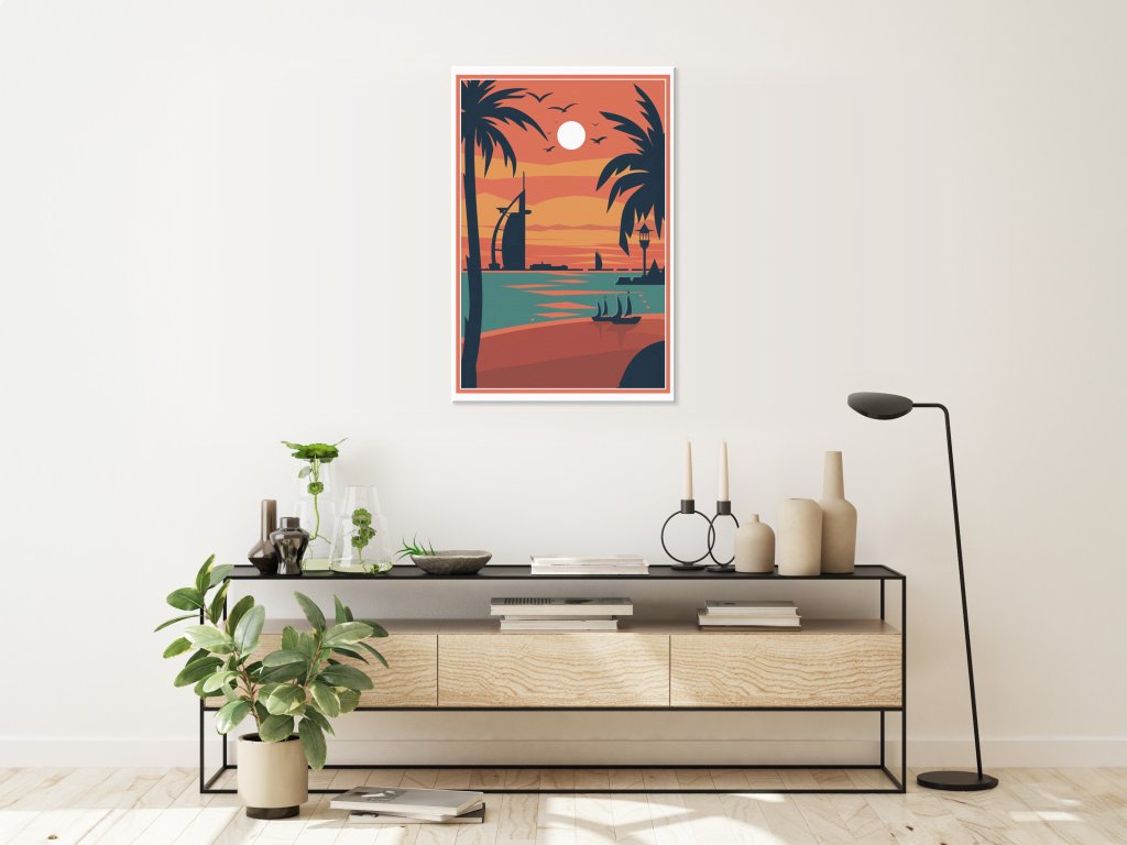 Tento obraz zachytáva nádherný západ slnka nad Dubajom s ikonickou siluetou Burj Al Arab v popredí. Okolo sú palmy a vtáky, ktoré dotvárajú exotickú atmosféru tejto scény. Plachetnice na mori a teplé farby západu slnka vytvárajú pokojný a romantický výhľad na toto moderné mesto.