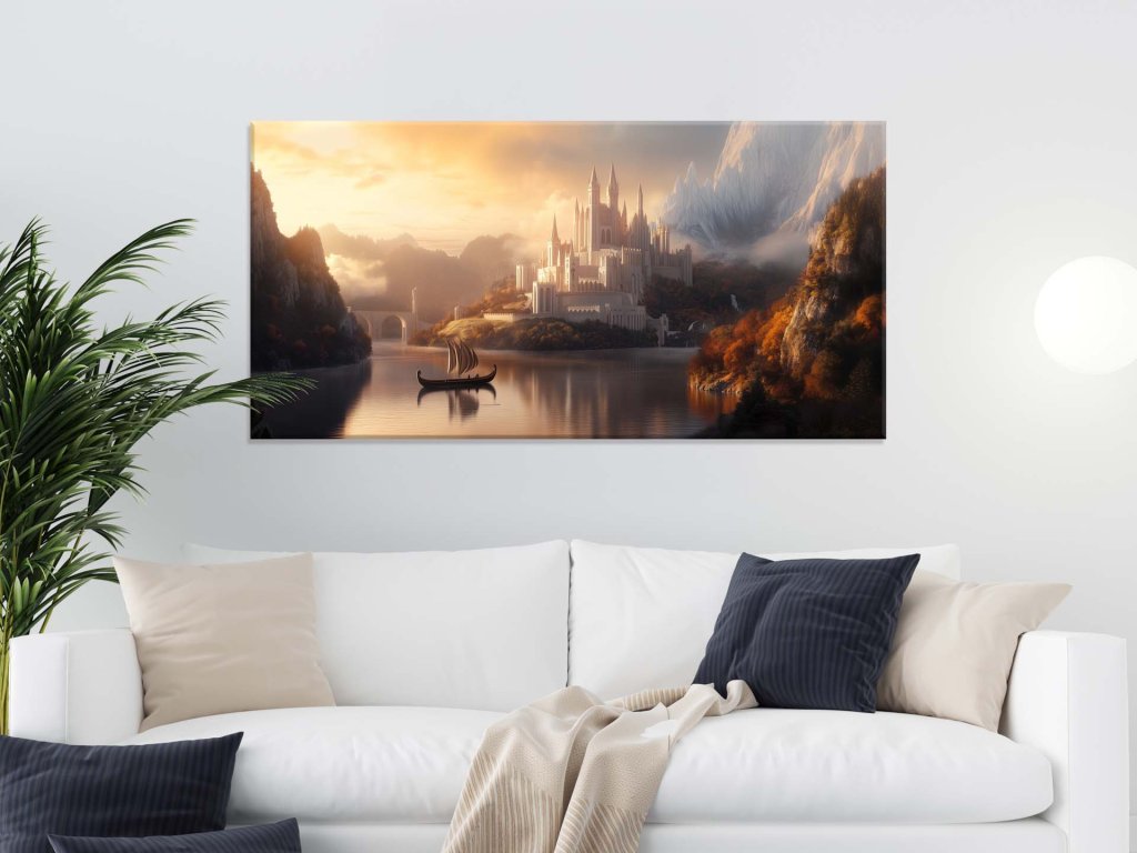 Tento obraz zachytáva veľkolepý hrad zasadený do scenérie obklopenej majestátnymi horami a pokojným riečnym tokom. Východ slnka zalieva krajinu jemným zlatistým svetlom, ktoré zdôrazňuje architektonickú krásu stavby a jesenné farby prírody. V popredí sa plaví loď, ktorá symbolizuje pokoj a harmóniu tohto mystického miesta.