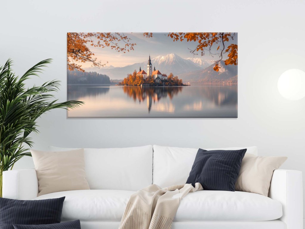 Obraz zachytáva jesenné ráno pri jazere Bled, kde sa v strede vodnej plochy vyníma ostrov s malebným kostolíkom. Okolité listnaté stromy žiaria v teplých farbách jesene a snehom pokryté hory v pozadí dotvárajú majestátnu scenériu. Pokojná hladina jazera vytvára dokonalé zrkadlenie krajiny, čím obraz vyžaruje absolútnu harmóniu a ticho.