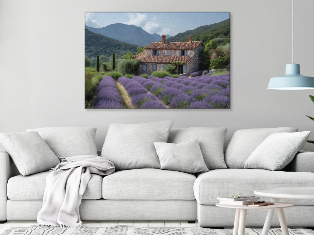 Klasický kameňom vystavaný dom sa týči uprostred rozkvitnutého levanduľového poľa. Na pozadí obrazu sa vypínajú zelené kopce a hory, zatiaľ čo dom je ohraničený bujnou zelenou vegetáciou. Tento idylický vidiek je zosobnením pokoja a vidieckej krásy.