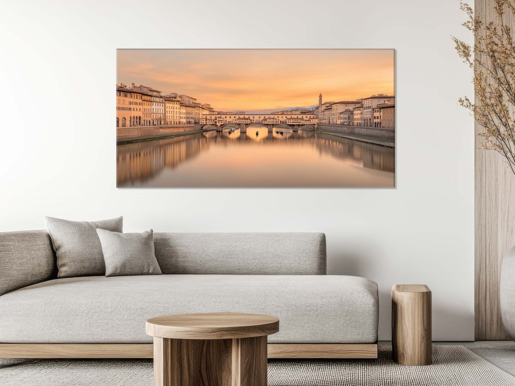 Pohľad na slávny most, ktorý spája dve historické časti mesta, ponúka nádhernú atmosféru podfarbenú teplými tónmi súmraku. Jemné odlesky svetla sa odrážajú na hladine rieky, zatiaľ čo loďky plávajú pod mostnými oblúkmi, dodávajúc scéne romantický charakter. Okolité budovy s renesančnou architektúrou dopĺňajú majestátnosť tohto miesta, ktoré dýcha históriou a eleganciou.