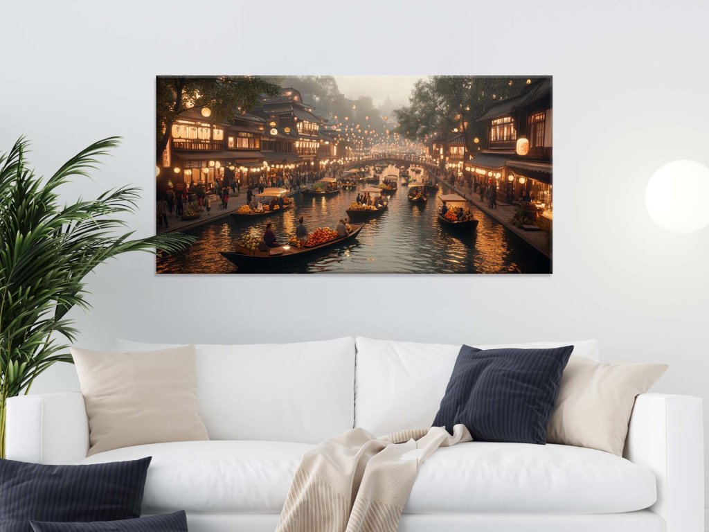 Obraz zachytáva čarovnú scénu nočného trhu na vode, kde sa tradičné drevené lode plavia po osvetlenom kanáli, preplnené ovocím a usmiatymi predavačmi. Na oboch stranách kanála sa tiesnia návštevníci medzi žiariacimi lampiónmi a historickými budovami. Atmosféra je plná svetla, vôní a príjemného ruchu, ktorý navodzuje pocit pokoja a radosti.