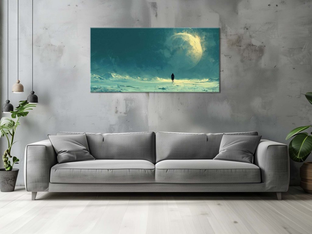 Na tomto surrealistickom obraze je zobrazená osamelá postava stojaca na ľadovej pustine so zamrznutým povrchom, pričom v pozadí dominuje veľký, detailne zobrazený mesiac. Obloha je zahalená v modrozelených odtieňoch s rozmazanými efektami, ktoré dodávajú scéne tajomný nádych. Atmosféra je posilnená pocitom izolácie a nesmiernej vzdialenosti od akéhokoľvek známeho sveta.