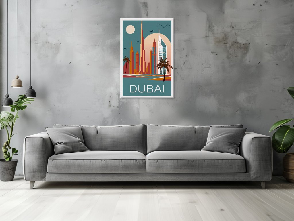 Obraz zobrazuje ikonickú panorámu Dubaja s výraznými modernými mrakodrapmi, vrátane Burj Khalifa a Emirates Towers. V popredí sú palmy, ktoré dodávajú scéne tropický nádych, zatiaľ čo vtáky lietajú nad mestom, čo vytvára dynamickú atmosféru. Farby obrazu odrážajú teplé tóny západu slnka, čím podčiarkujú krásu tohto futuristického mesta.
