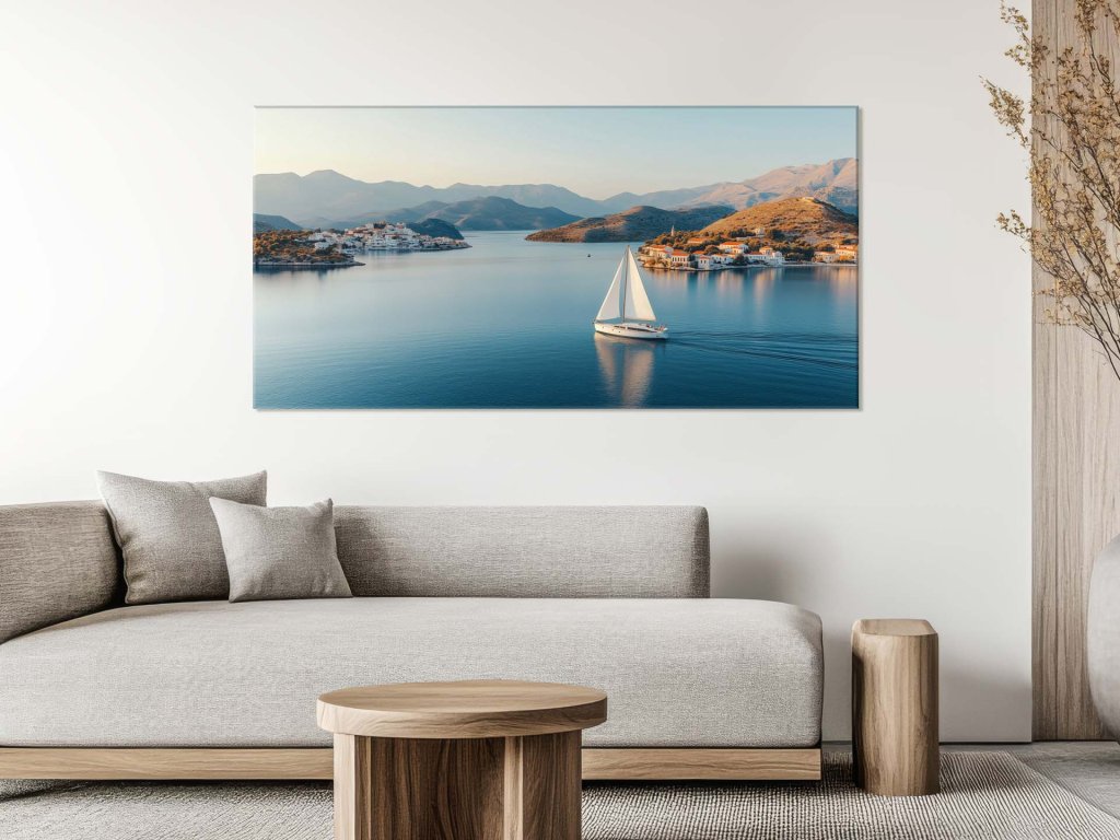 Obraz zachytáva pokojnú stredomorskú scenériu, kde sa plachetnica pomaly presúva cez azúrové more. Na oboch stranách sa nachádzajú ostrovy s typickými bielymi domčekmi a červenými strechami, obklopené kopcovitou krajinou. V diaľke sa tiahnu majestátne hory, zatiaľ čo zapadajúce slnko dodáva celej scenérii teplý, zlatistý odtieň.