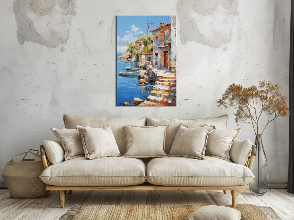 Tento obraz zachytáva pokojné prímorské mestečko, kde farebné domy lemujú pobrežie a malé loďky sa jemne kolíšu na pokojnej vode. Slnečné svetlo ožaruje celý výjav, zvýrazňuje detaily architektúry a odrazy na vode, čím vytvára teplú a prívetivú atmosféru. Umelcova technika a použitie živých farieb zdôrazňujú krásu a jednoduchosť stredomorského života, pričom diváka pozývajú na chvíľu sa zastaviť a vychutnať si pokoj a krásu prímorského prostredia.