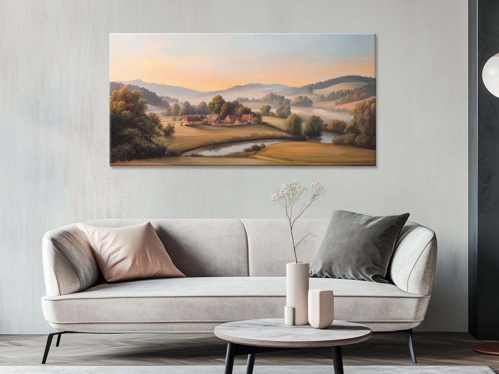 Obraz zachytáva malú dedinu, ktorá sa prebudila do pokojného rána zahaleného jemnou hmlou. Malebné domčeky sú obklopené bujnou zelenou, pričom rieka vinúca sa popri dedine odráža pastelové farby ranného neba. V pozadí sa tiahnu kopce pokryté lesmi, ktoré dodávajú krajine pocit ticha a škody.