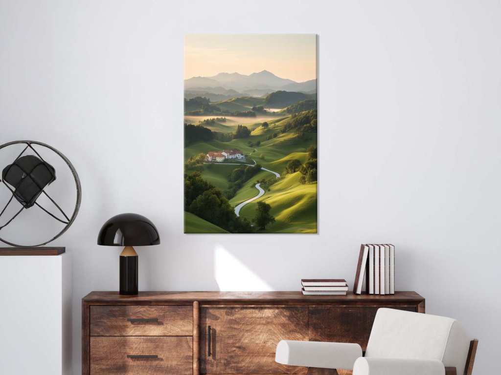 Obraz zachytáva harmonickú scenériu v rannom svetle, kde sa biele budovy usadlosti vynímajú medzi zvlnenými kopcami pokrytými sviežou zeleňou. Kľukatá cesta vedie diváka pohľadom naprieč krajinou až k vzdialeným hmlistým horizontom a majestátnym horám. Mier a jemné svetlo vyžarujú z každej časti tejto idylickej vidieckej scenérie.