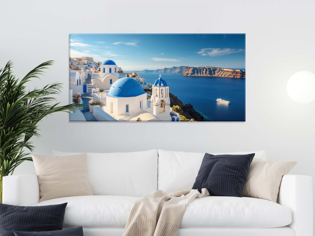 Tento obraz zachytáva ikonické biele budovy s modrými kupolami na strmých útesoch Santorini, kde sa architektúra dokonale spája s farbami prírody. Azúrové more sa rozprestiera pod mestom a veľká výletná loď sa pokojne plaví na horizonte. Jasná modrá obloha a teplé slnečné svetlo dodávajú scenérii neopakovateľnú atmosféru pokojnej gréckej dovolenky.