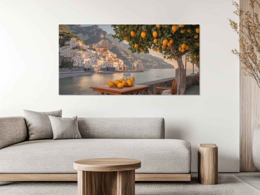 Obraz zachytáva idylické pobrežie Stredozemného mora s malebným mestečkom zasadeným do skalnatého útesu. V popredí sa nachádza terasa s dreveným stolom, na ktorom sú položené čerstvé citróny, pričom nad ním sa rozprestiera bohatý citrónovník. Teplé svetlo zapadajúceho slnka dodáva scéne pokojnú atmosféru a zdôrazňuje romantický šarm tejto stredomorskej destinácie.
