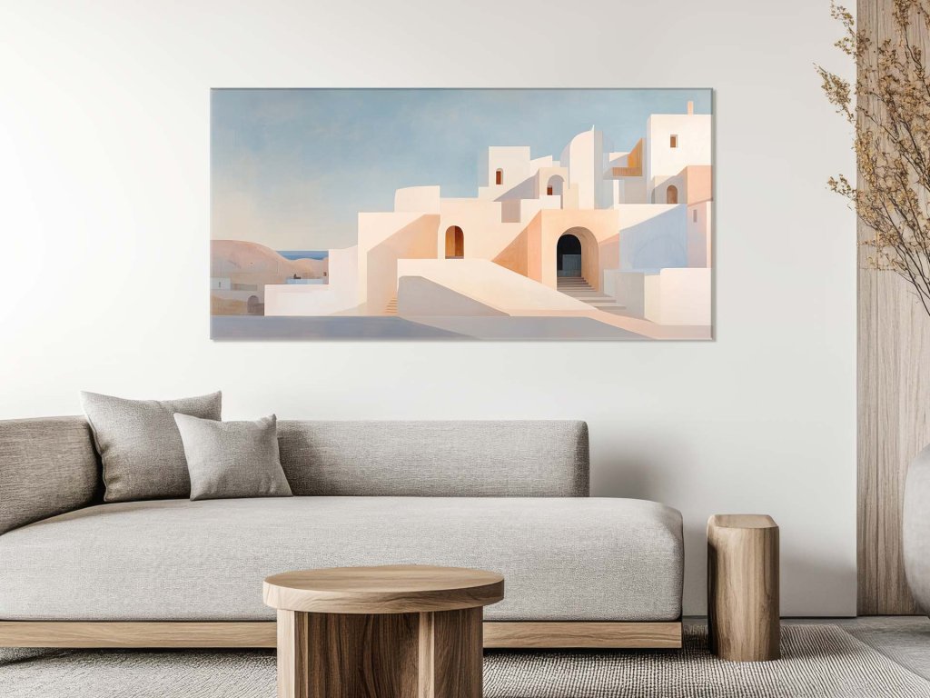 Obraz zobrazuje jednoduché, no výrazne tvarované budovy typické pre prímorské oblasti Stredomoria, ladené do svetlých, pastelových tónov. Svetlo a tieň vytvárajú na fasádach pôsobivý kontrast a dodávajú architektúre hĺbku aj rytmus. V diaľke sa črtá pobrežie a obloha, čím celé dielo pôsobí pokojne a harmonicky.