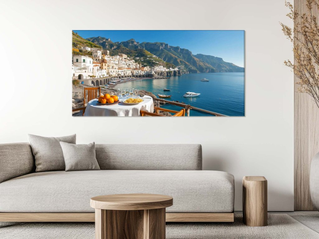 Tento obraz zachytáva pokojný moment na pobreží s nádherným výhľadom na azúrové more a historické mestečko s bielymi domami rozprestierajúcimi sa na svahu. Na terase s drevenými stoličkami je prestretý stôl s čerstvými pomarančmi, tanierom cestovín a pohármi vína, čím vytvára dokonalú atmosféru talianskej pohostinnosti. V diaľke kotvia luxusné jachty, ktoré dopĺňajú scenériu typickú pre pobrežie Stredozemného mora.