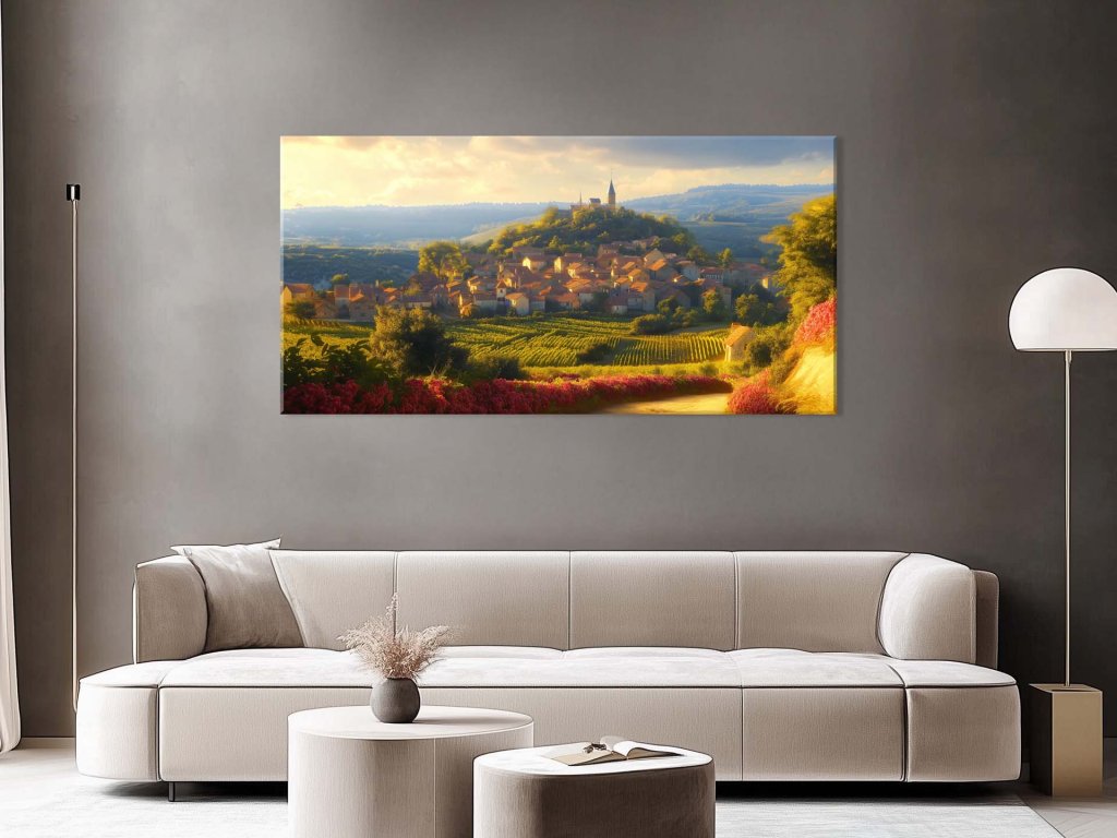 Tento obraz zobrazuje mestečko zasadené na kopci, s kamennými domami s červenými strechami, obklopené bujnými vinicami a rozsiahlou zeleňou. Zlatisté slnečné lúče z neskorého popoludnia osvetľujú krajinu, čo vytvára jemnú a romantickú atmosféru, zatiaľ čo vinice a polia dodávajú scéne pocit pokoja a úrody. V diaľke je viditeľný kostolík na vrchole kopca, ktorý dominuje mestečku a vytvára obraz malebného, harmonického života na vidieku.