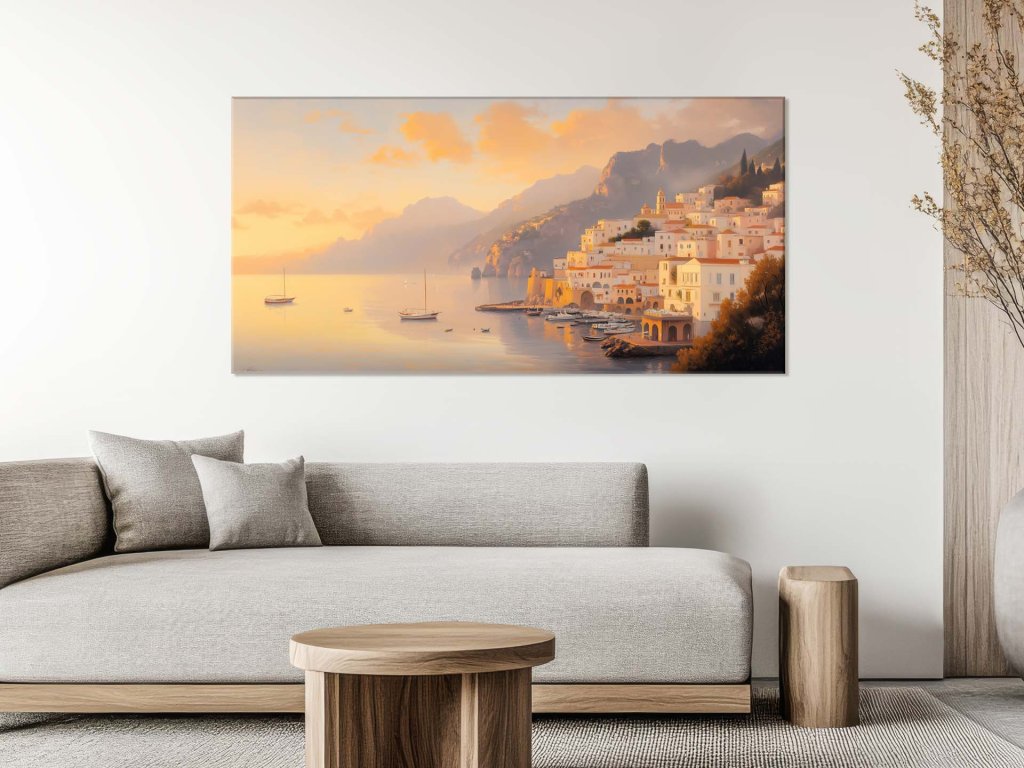 Obraz zachytáva idylické pobrežné mestečko s pastelovými domami usadenými na skalách, ktoré sa zvažujú k tichému prístavu. More odráža jemné farby vychádzajúceho slnka a niekoľko člnov sa pokojne kolíše na hladine. Svetlo prenikajúce cez ranný opar vytvára pokojnú a hrejivú atmosféru, akoby čas plynul pomalšie.