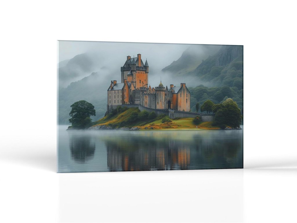 Stredoveký hrad so špicatými vežami stojí na ostrove v jazere. Jemná hmla obopína zelené lesy a vrcholky hôr v pozadí, čo dodáva scéne tajomnú atmosféru. Odraz hradu na pokojnej vodnej hladine jazera spolu s kontrastnými farbami krajiny vytvára pôsobivý a pokojný obraz.