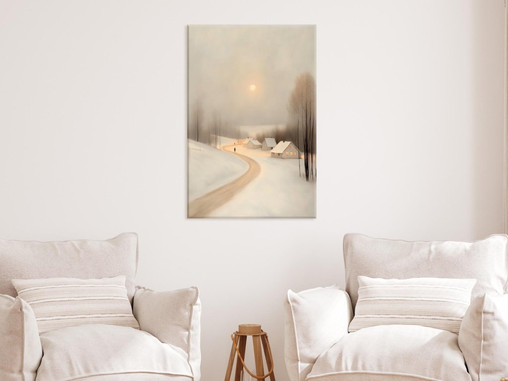 Obraz zachytáva pokojnú zimnú scenériu malej dedinky, kde jemne osvetlené domy kontrastujú s bielou krajinou a sivou oblohou. Kľukatá cesta vedie diváka k srdcu kompozície, kde osamelý chodec kráča v ústrety teplu domova. Zimné slnko visí nízko na oblohe, čím dotvára atmosféru nostalgie a pokoja zimného obdobia.