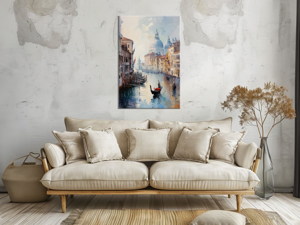 Tento obraz zachytáva pokojné ráno v Benátkach, kde gondoly ticho plávajú po kanáli, obklopené historickými budovami a nádhernými kupolami v pozadí. V rannom svetle sa odrážajú jemné odtiene na vode, čo vytvára harmonickú a romantickú atmosféru. Detailné prevedenie architektúry a jemné farebné prechody pridávajú obrazu realistickosť a zároveň snovosť, ktorá dokonale vystihuje čaro Benátok.