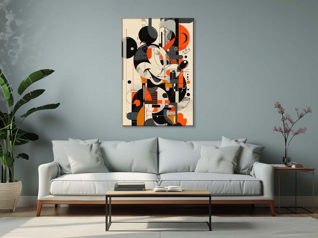 Tento obraz predstavuje abstraktnú a modernú interpretáciu známej postavičky s použitím geometrických tvarov a odtieňov béžovej, čiernej a oranžovej. Dominantné čiary a plochy vytvárajú dynamický a komplexný obraz, ktorý zachytáva pohyb a emócie charakteru. Kompozícia je oživená prvkami škvrnitého abstraktného maliarstva a grafickými symbolmi, ktoré pridávajú hĺbku a zaujímavosť.
