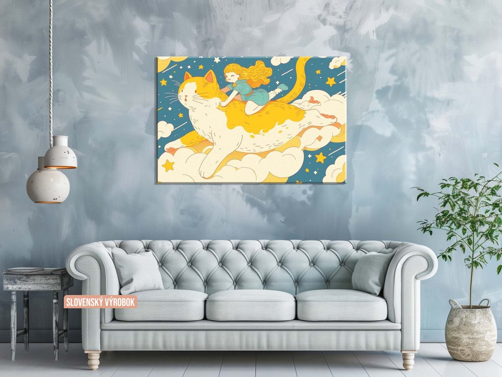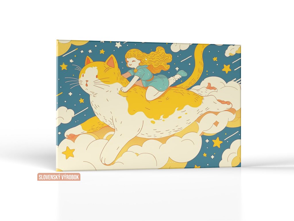 Na obraze vidíme veselé dievčatko, ktoré sedí na chrbte obrovskej mačky, pričom spolu lietajú medzi oblakmi a hviezdami. Mačka má bielo-žltú srsť a letí cez nočnú oblohu plnú hviezd a komét. Dievčatko má na tvári šťastný úsmev, čo vytvára pocit bezstarostnej radosti a fantázie.