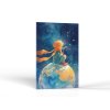 Na obraze je zobrazený malý princ, ktorý sedí na vrchole planéty s ružou v ruke a šálom vejúcim vo vetre. Okolo neho je nočná obloha plná hviezd a kvetov, čo vytvára pocit pokoja a snívania. Tento obraz evokuje krásu jednoduchých radostí a zázrakov vesmíru, ktoré malý princ objavuje počas svojich ciest.