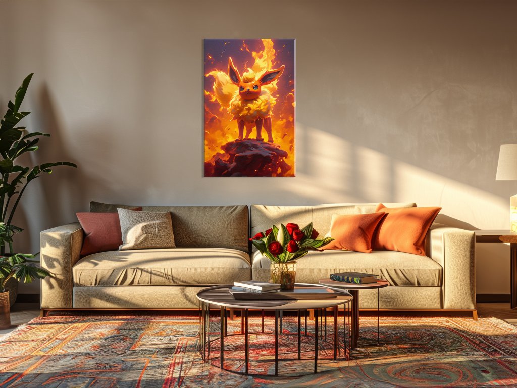 Tento obraz zobrazuje pokémona, ktorý stojí na skale uprostred plameňov, s hrdým a odhodlaným výrazom na tvári. Jej srsť a chvost sú ako oheň, plné žiarivých oranžových a žltých tónov, ktoré dokonale splývajú s okolitým ohňom. Scéna vyžaruje energiu, silu a neochvejného ducha, ktorý z pokémona robí dominantný prvok tohto dramatického obrazu.