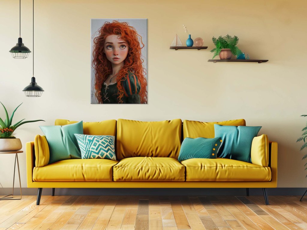 Tento obraz predstavuje mladú ženu s nápadnými ryšavými vlasmi a jemnými pehami roztrúsenými po tvári. Jej výrazný pohľad a veľké modré oči vynikajú na jemne osvetlenom pozadí, čo jej dodáva etérický vzhľad. Detaily ako šnúrky na šate a náhrdelník pridávajú hlbšie vrstvy a textúru do obrazu, ktorý zdôrazňuje jemnosť a eleganciu postavy.