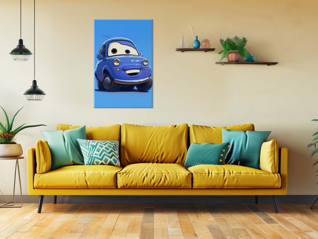 Tento obraz predstavuje animovaný modrý automobil s charakteristickými veľkými, okrúhlymi očami a širokým úsmevom, ktorý dodáva autu osobnosť. Auto má žiarivo modrú farbu, ktorá je výrazne kontrastovaná s jasným modrým nebom na pozadí. Jeho veselý výraz a živé farby robia z neho ideálny obraz pre detskú izbu alebo pre milovníkov veselých, hravých dizajnov.
