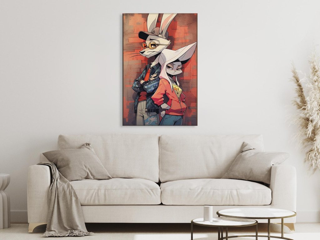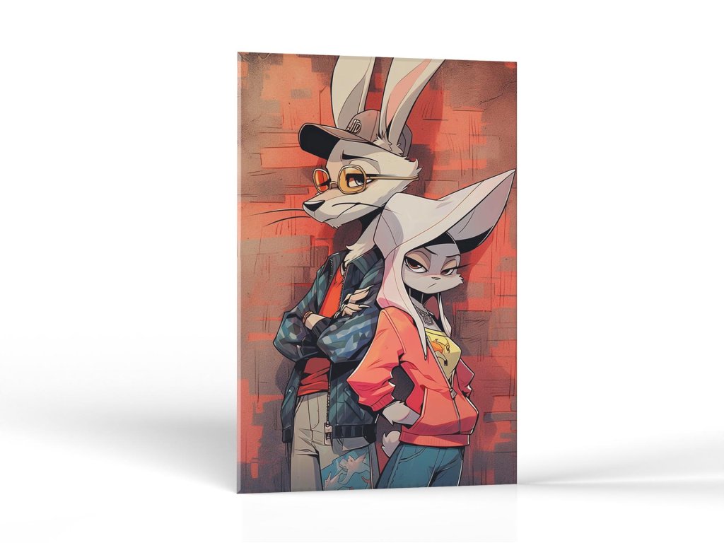Na obrázku sú zobrazené dve antropomorfné zajačie postavy, jedna s okuliarmi a šiltovkou a druhá s kapucňou, obidve v mestskom oblečení. Majú postoj zobrazujúci sebavedomie a štýl. Ich expresívne pozície a odhodlané výrazy odrážajú mladistvú energiu a nonšalanciu. Farby na pozadí sú hrejivé a sýte, dopĺňajúce dynamickú atmosféru obrázku.