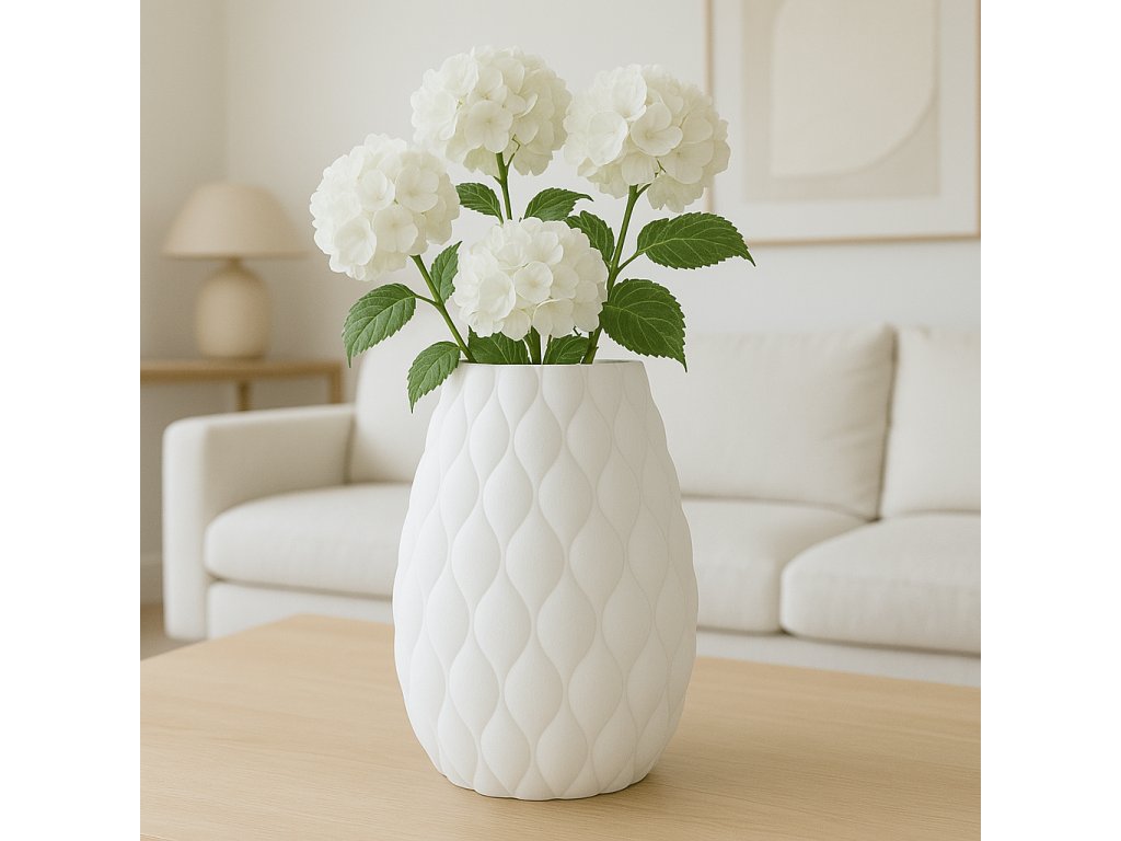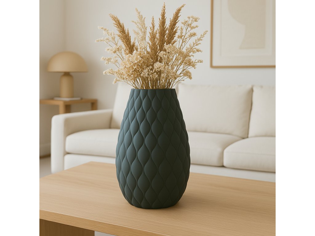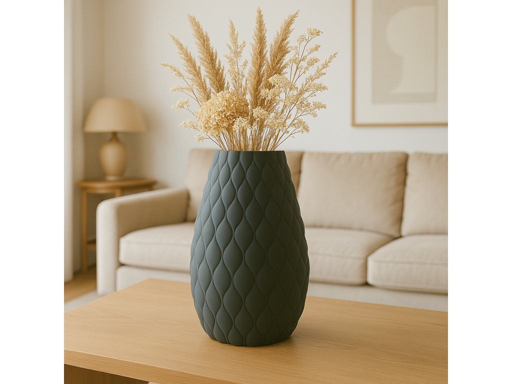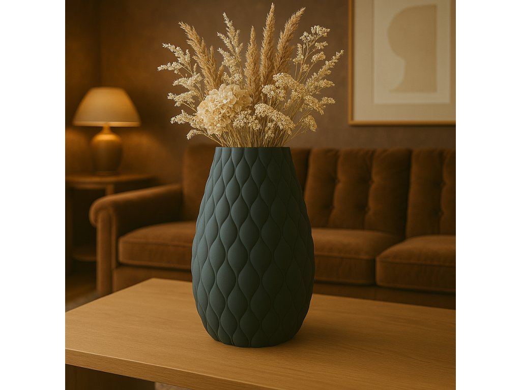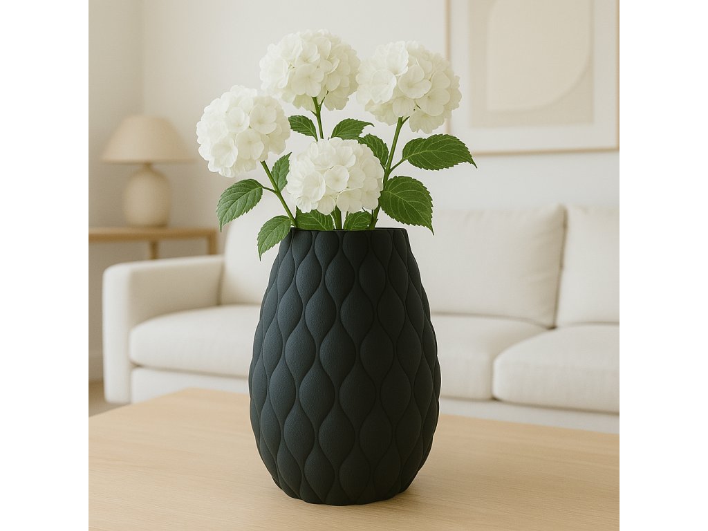 Váza Luma Noir v sebe spája nadčasový dizajn a hĺbku štruktúry. Jemne organický tvar v kombinácii s elegantným diamantovým vzorom robí z tejto vázy pútavý doplnok do každého moderného interiéru. Matný čierny povrch vynikne najmä v minimalistickom alebo severskom štýle, no dokáže zaujať aj ako solitér.