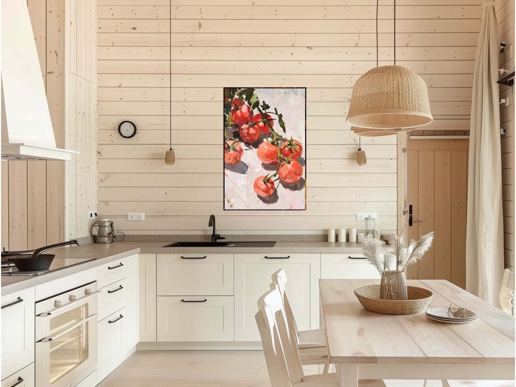 Tento obraz zobrazuje zhluk čerstvých paradajok na stonke, ktoré ležia na svetlom povrchu. Paradajky sú detailne zobrazené, pričom farby sú živé a výrazné, čo vytvára dojem sviežosti a prirodzenosti. Svetlo dopadajúce na paradajky a jemné tiene na pozadí dodávajú obrazu hĺbku a realistický vzhľad.