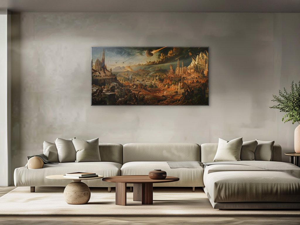 Obraz zobrazuje apokalyptickú krajinu, ktorá je pod útokom padajúcich meteoritov, pričom v pozadí vidno horiace budovy a zničené mestské scenérie. V popredí sa nachádzajú ruiny budov a zúfalí ľudia, ktorí hľadajú útočisko pred chaosom. Atmosféra je naplnená pocitom skazy a beznádeje, zvýraznená dramatickým osvetlením a hustými oblakmi dymu na oblohe.